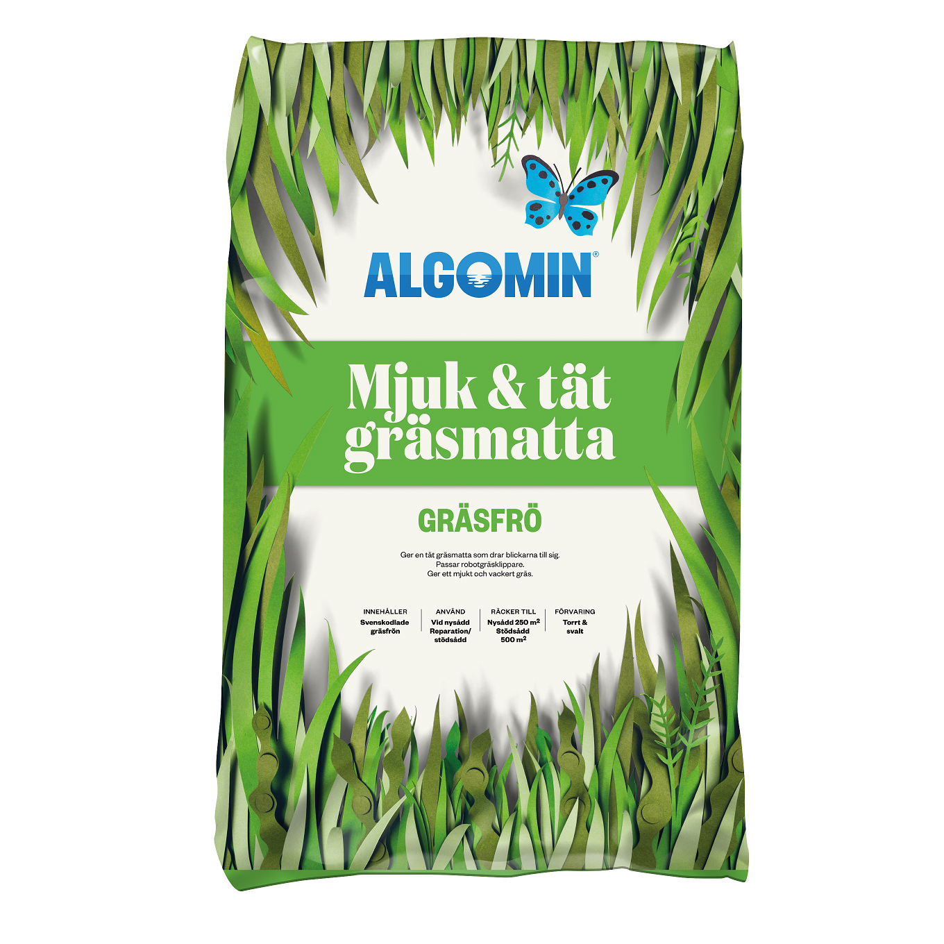 Algomin Mjuk & tät gräsmatta ger en vacker och tätväxande gräsmatta som kräver färre klippningar, och tål att klippas kort. Fröblandningen innehåller torktålig rödsvingel och sjukdomsresistent ängsgröe – svenskodlade gräsfrön av högsta kvalitet. I den här blandningen är all rödsvingel tätväxande sorter och ängsgröen bidrar med slitstyrka. Mjuk & tät gräsmatta är en gräsfröblandning som fungerar i hela Sverige.