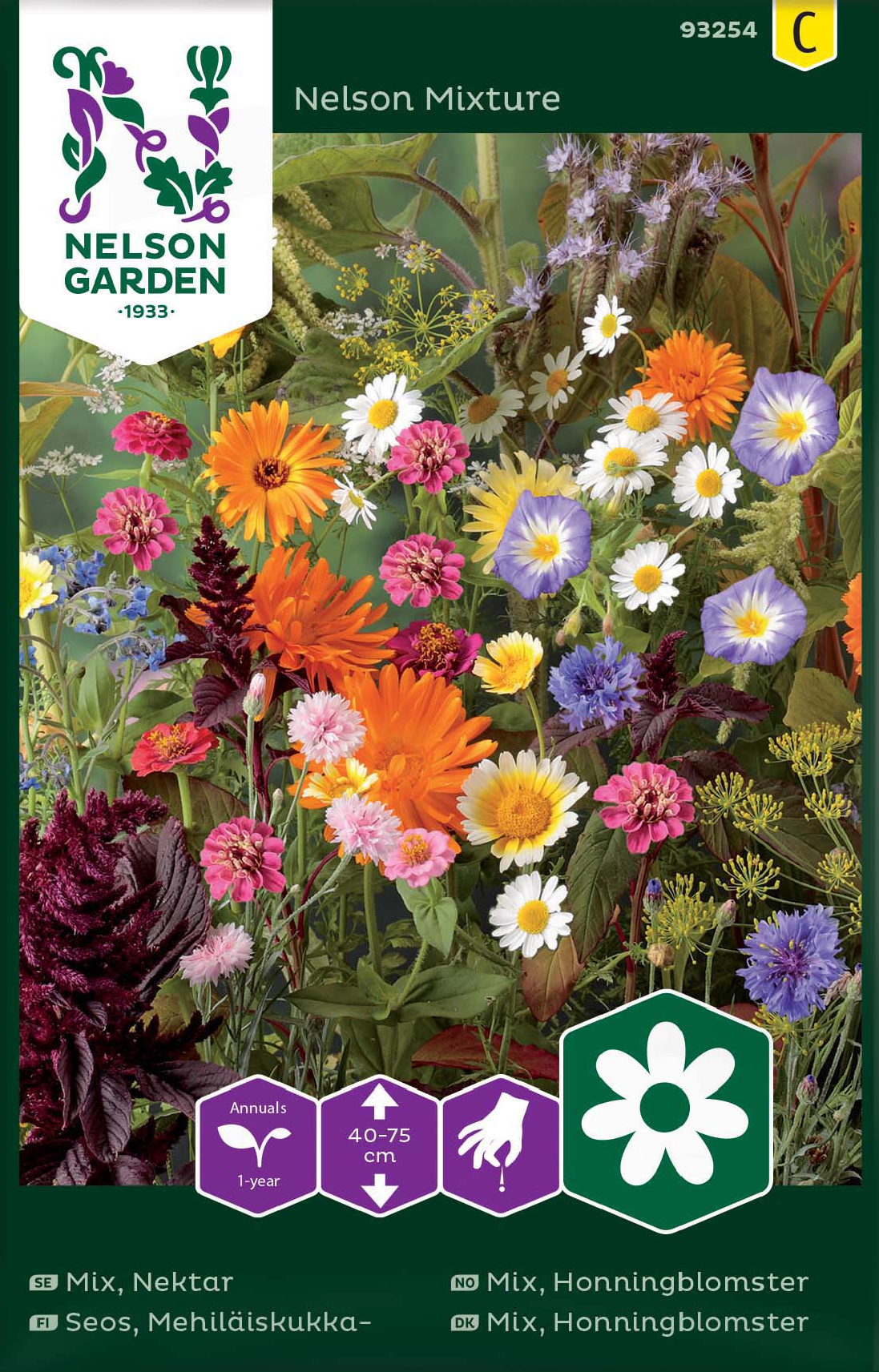 Sorterna är utvalda för att locka till sig och ge nectar åt bin. Bin behövs för pollinering i trädgården och skänker också liv och rörelse en stilla sommardag. Blandningen innhåller bl a reseda, gurkört, honungsfacelia och praktmalva. Trivs på lucker mullrik jord, men många av sorterna är anspråkslösa. Vattna rikligt vid torka.