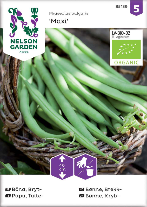 Denna brytböna som även kallas buskböna är en extra tidig sort som ger vackert gröna baljor. Skörda bönorna på brytböna ’Maxi’ efterhand, låt inte baljorna bli för stora, ca 18 cm är lagom. Utsökta att koka, steka eller konservera.