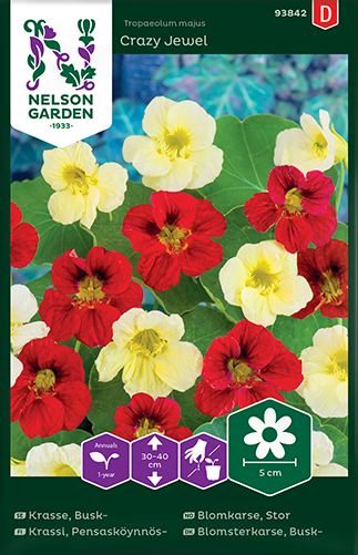 Tuff färgkombination av sorterna ’Primrose Jewel’ och ’Mahogany Jewel’. Fin som kantväxt, i balkonglådor och rabatter. Blommorna går att äta, dekorativa i sallader. Omogna frön kan läggas in som kapris. Trivs i mager och väldränerad jord. I alltför näringsrik jord utvecklas bladen på blommornas bekostnad. Vattna regelbundet och ge sparsamt med näring. Lägg fröna i ljummet vatten ett dygn före sådd, så gror de säkrare.
