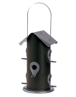 Stor fågelmatare för fågelfrö. Tak och botten i grå, behållare i svart metall. 6 foderuttag med sittpinne i grå plastöverdragen metall. Fylls på uppifrån. Rymmer ca 3 liter. H 32 cm Ø 16 cm