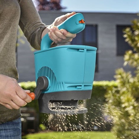 Handhållen Spridare från GARDENA passar perfekt att fördela ut gödningsmedel och vägsalt på mindre ytor. Spridningsmängden ställs in direkt med det ergonomiska handtaget och för att få ut innehållet använder du helt enkelt spridarens handvev.