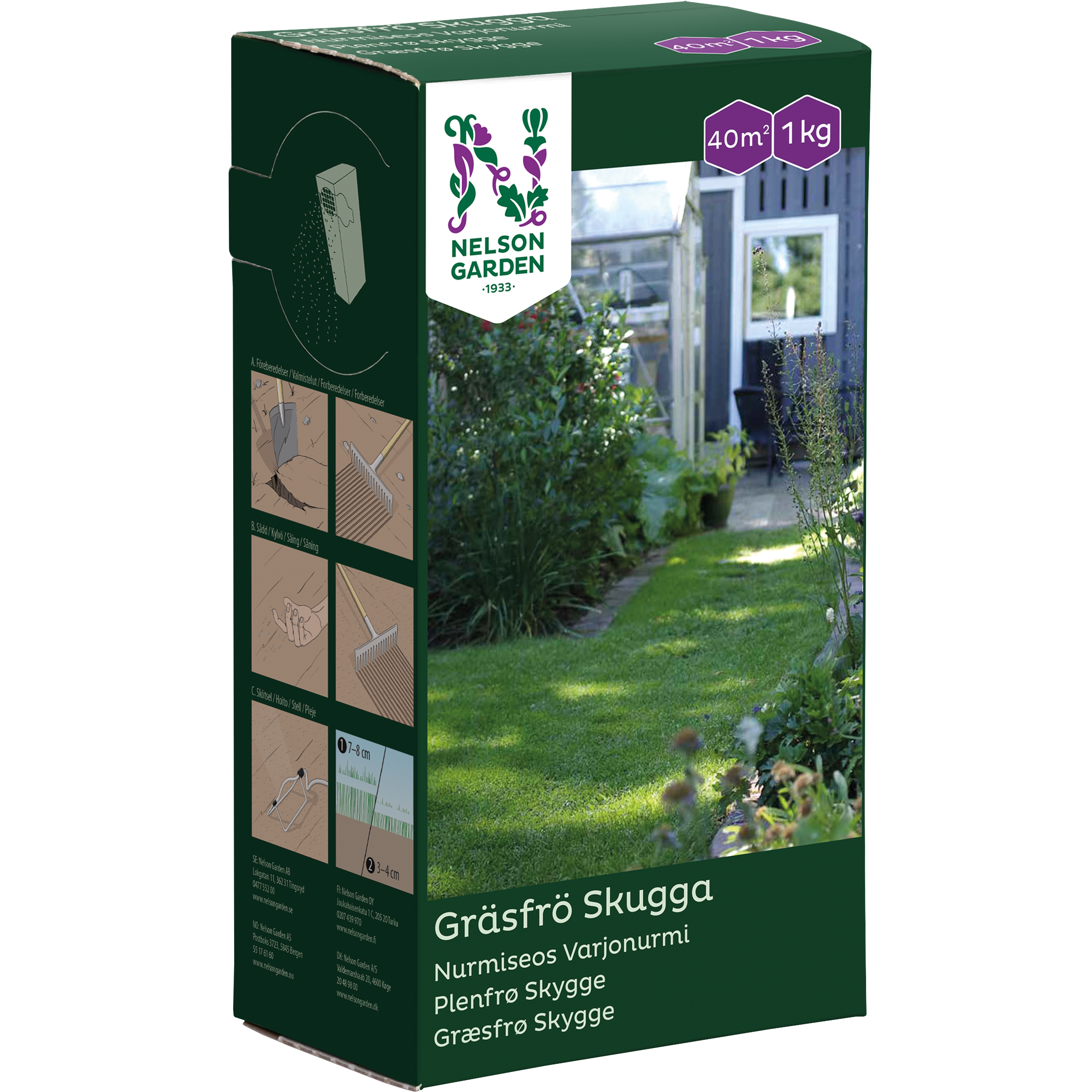 Nelson Gardens skuggtåliga gräsfröblandning. Passar i trädgårdens lite mörkare och fuktigare delar, t.ex. under häckar och träd. Ger en tät grönska i svåra lägen. Den här gräsfröblandningen kan sås så snart jordtemperaturen är minst 8 °C. Vid sådd på våren är vattningen viktig. Vid sådd på sensommaren är luften fuktig och konkurrensen från ogräset mindre.
