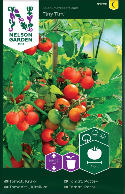 Tiny Tim är en lättodlad körsbärstomat för odling i kruka på balkong, fönsterkarm, växthus eller utomhus i mycket skyddat läge. Riklig skörd av små tomater med söt smak. Trivs i näringsrik, väldränerad jord. Vattna regelbundet. Skotten i bladvecken, "tjuvarna", tas ej bort. Ruska lätt på blomklasen, så gynnas fruktsättningen.