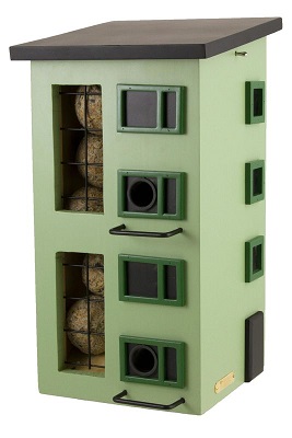 Fågelmatare i snygg husmodell. Den har separata platser för talgbollar, fågelfrö och jordnötter.
